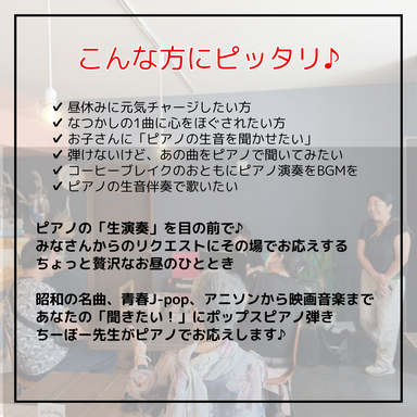 「聞きたい曲をリクエストすると、その場で私、ちーぼー先生ことポップスピアノ弾き山田千春がアレンジしてピアノで演奏する」イベントです。